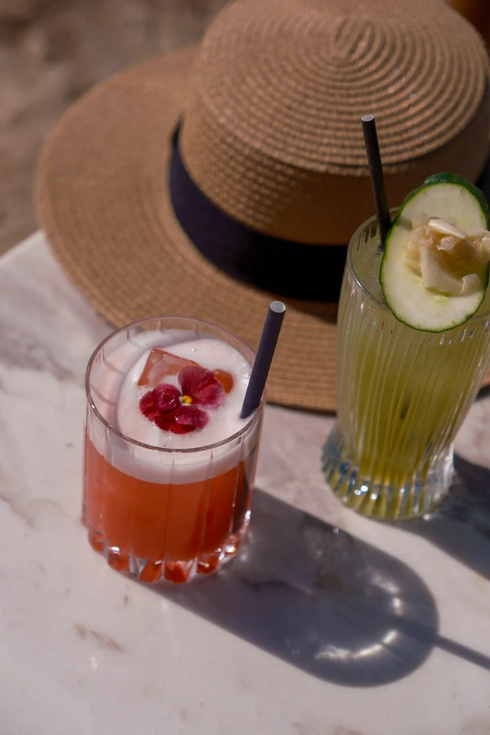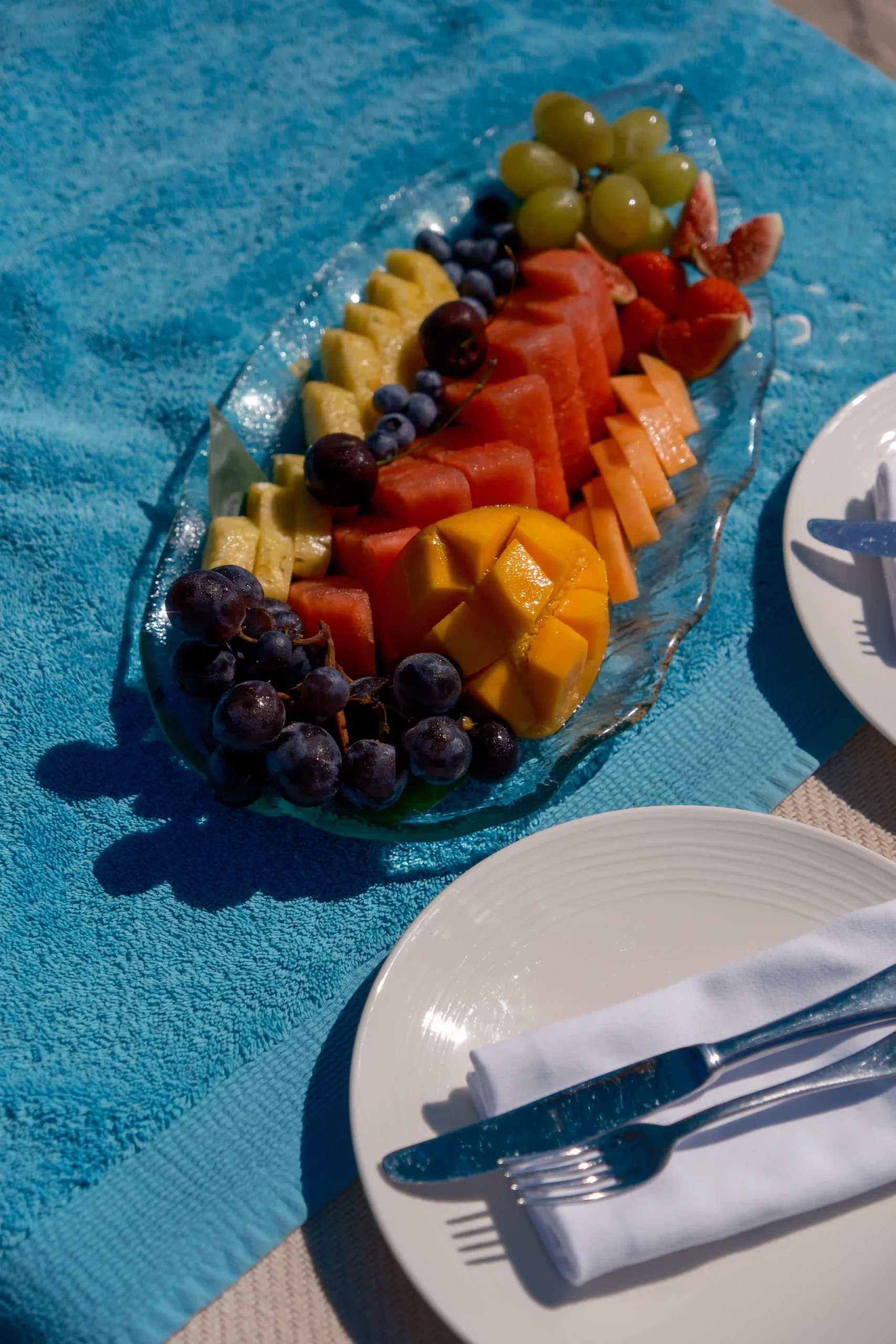 Not long after settling in, we were surprised with two signature mocktails, both so beautifully presented they could have graced the pages of a glossy magazine. Alongside a fresh fruit platter served on crisp white napkins with polished silver cutlery. It’s these subtle details that make Nammos feel more like a private retreat than a public beach club.