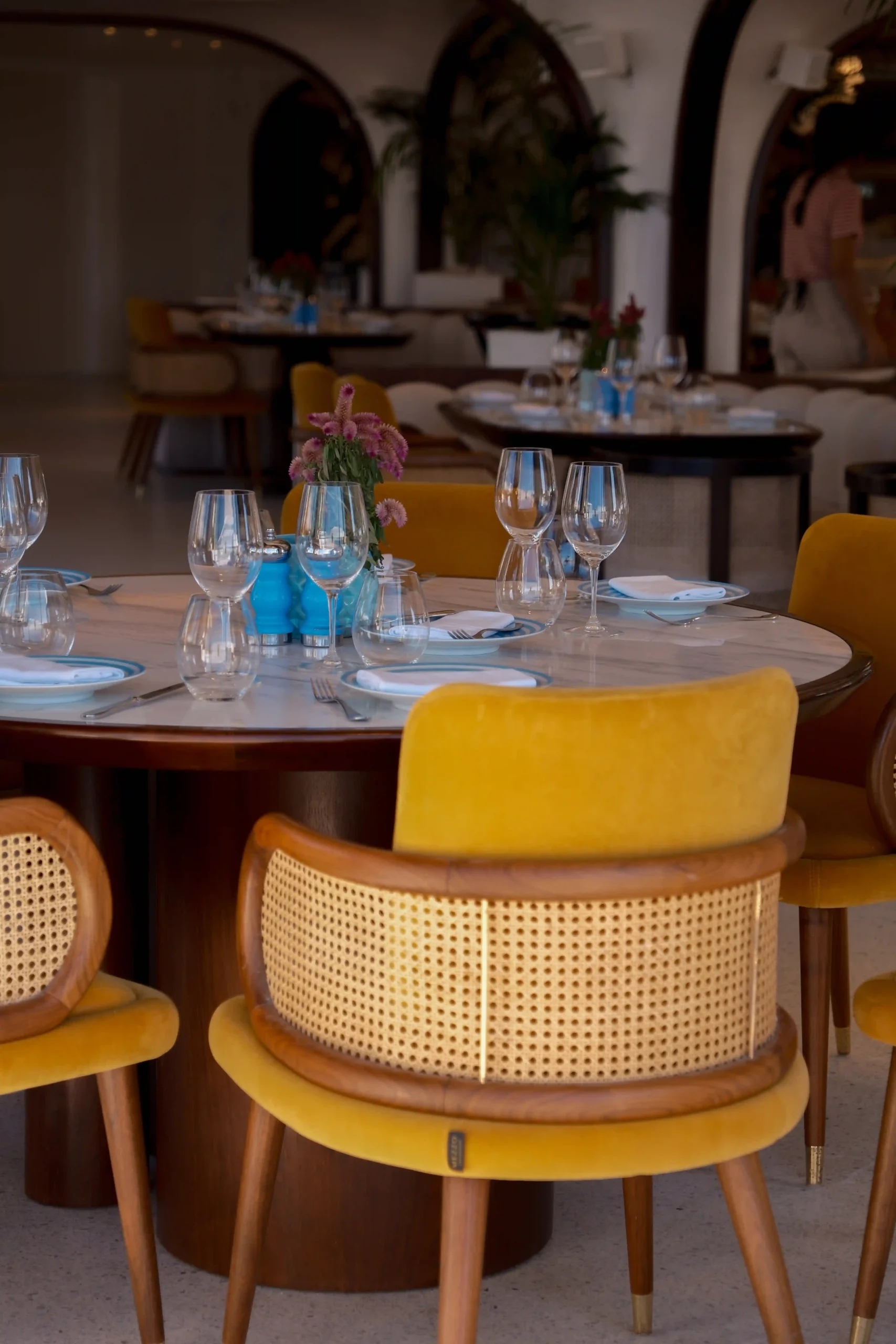 While the terrace invites alfresco charm, stepping inside the restaurant is equally worthwhile (especially for dinner), but also for lunch if you want a taste of the interior design’s full effect. The décor leans toward a Mediterranean modern style, with abundant natural light, clean lines, whitewashed walls, touches of pale stone and light wood, and pops of rich color in upholstery and decorative details, a graceful nod to Mykonos aesthetics adapted to the Riviera. It’s airy and bright, yet warm and textured.