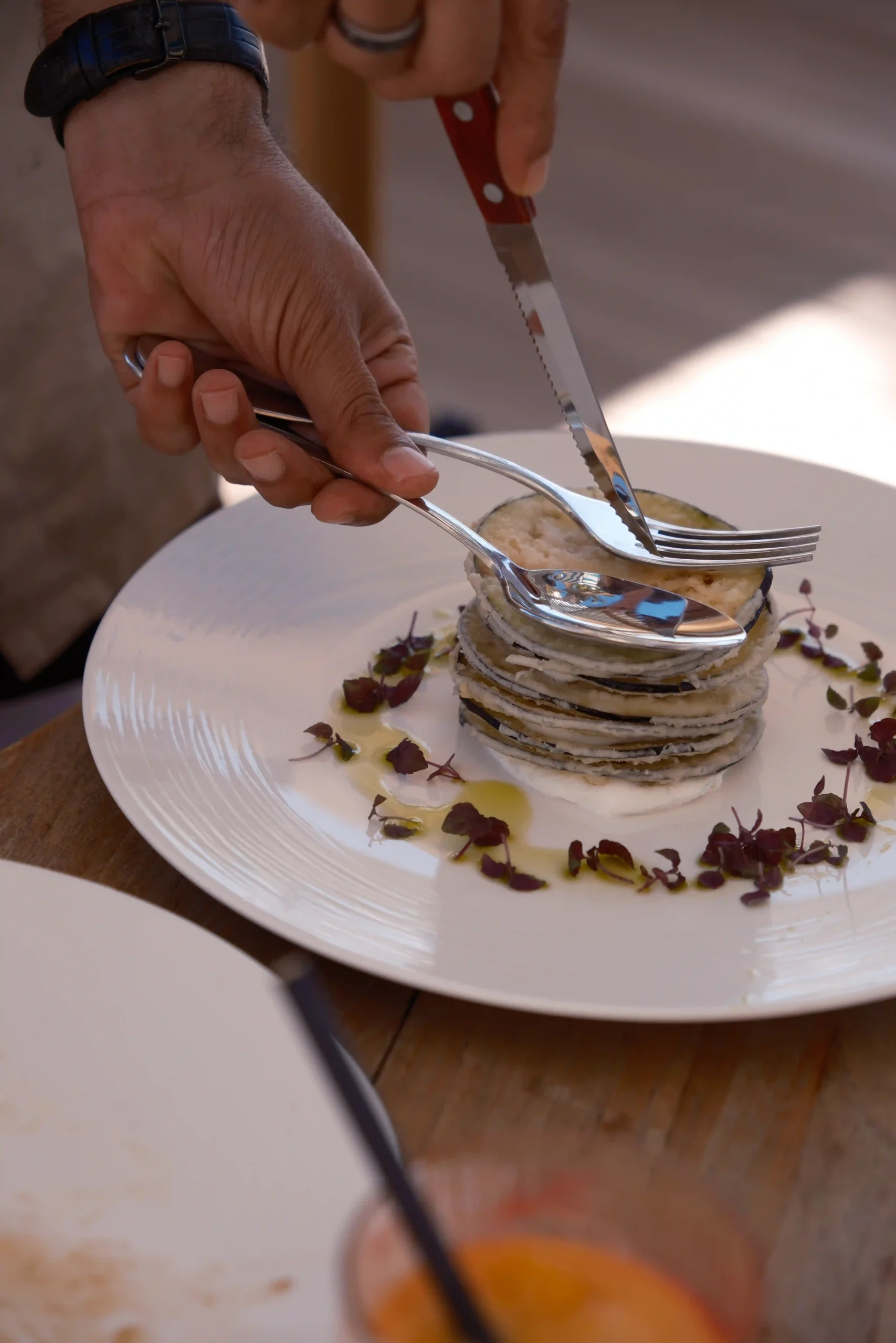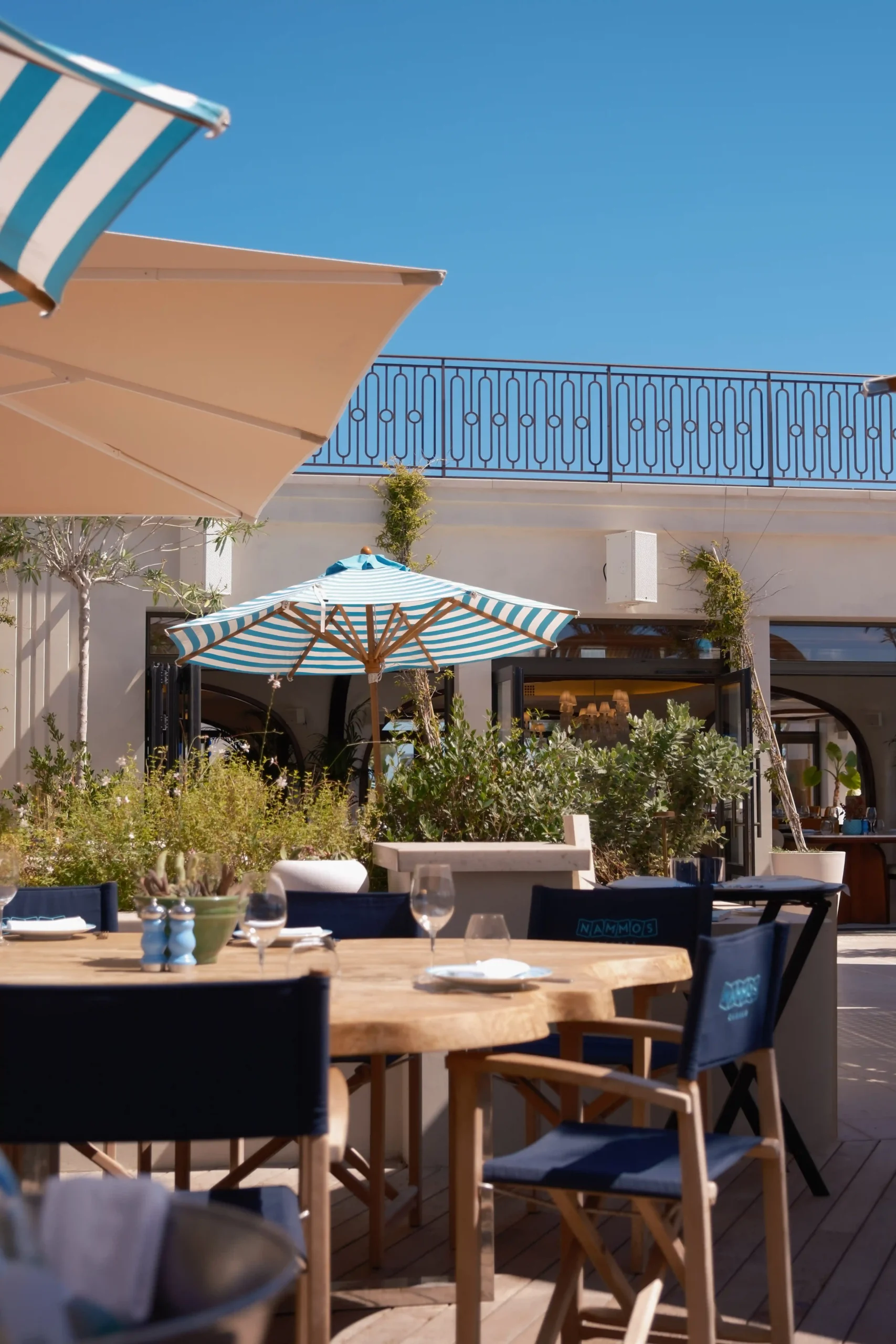 We settled onto a sunlit terrace with tables hewn from rustic wooden trunks, each one unique, the grain and texture of the wood speaking of organic luxury. Overhead, turquoise-and-white striped parasols cast playful shadows, giving the terrace that signature Riviera look, chic yet relaxed, elegant in its simplicity.