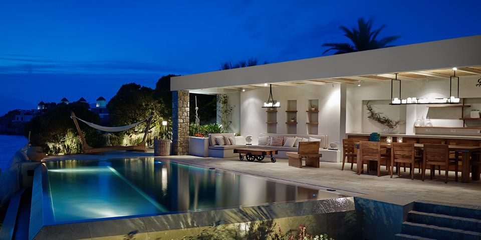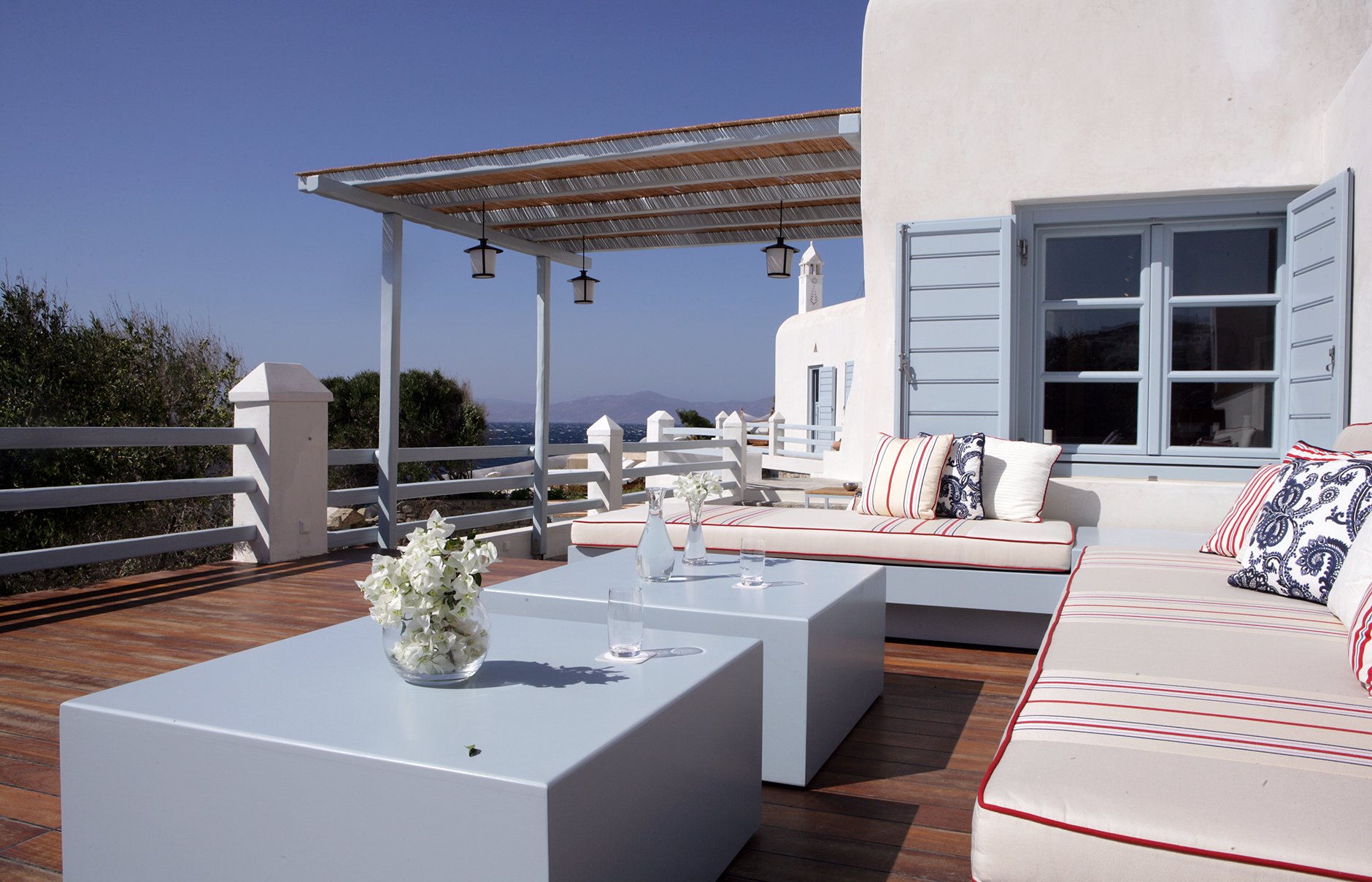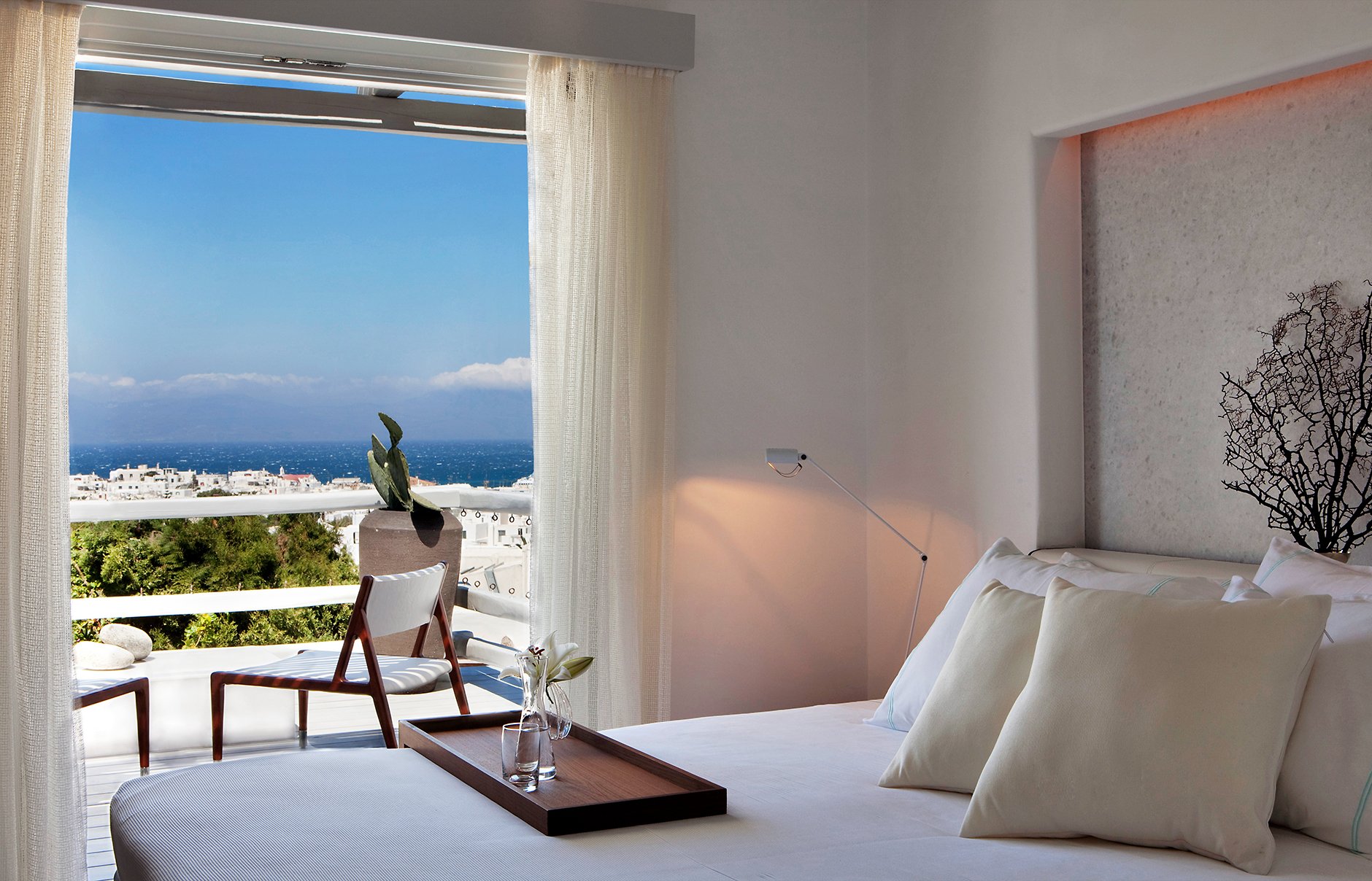 The white buildings of this Mykonos hotel complex resemble a traditional Cycladic village. Inside, though, they’re unexpectedly urbane